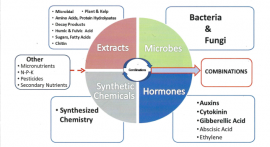 Biostimulants fall into specific categories: extracts (e.g., amino acids, fulvic acids, and some microbials), microbes (bacteria and fungi), hormones (e.g., auxins, cytokinins), synthetic chemicals (e.g, fungicides that have stress relieving properties), and nutrients/fertilizers.
