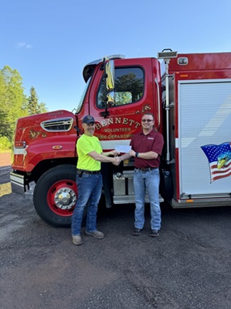 In July, Justin Flamang of Federated (pictured on the right) presented a check to Chief Travis Theien to support the Bennett Wisconsin Fire Department. The Fire Department is rural volunteer department that helps support and serve the community. The funds will be used to buy new turnout gear, radios and SCBA tanks for the firefighters.