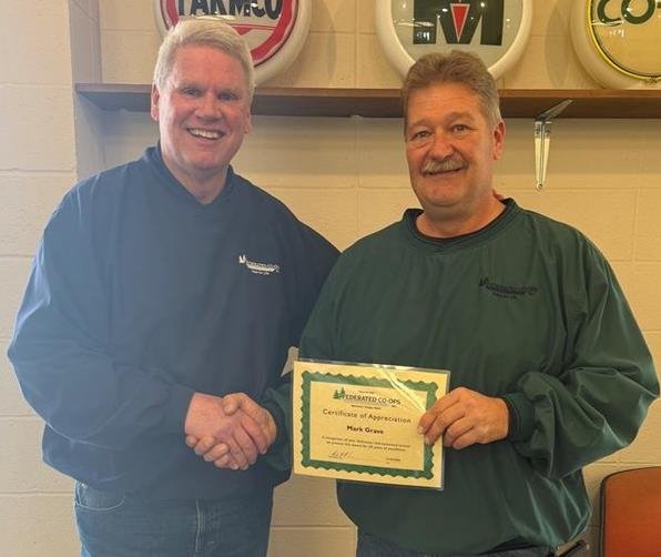 Mark Grave on the right, celebrated 30 years with the Co-op on January 2, 2026. Mark originally from Iowa, packed his wife and two young children and moved to Kettle River, MN to start as a Service Manager. That was the start of something special for the co-op and his family. This courage and confidence in his own abilities are two great traits he displays today in his current position.